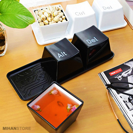 پیاله یا لیوان 3 تایی یک محصول جدید با طراحی ویژه و جالب می باشد که بصورت دکمه های کیبورد طراحی شده و کلمه های Ctrl - Alt - Delete بر روی انها نوشته شده که در صورت قرار دادن بر روی سینی مخصوص کاملا شبیه به صفحه کیبورد می باشد.