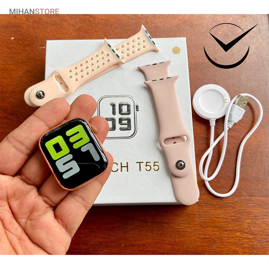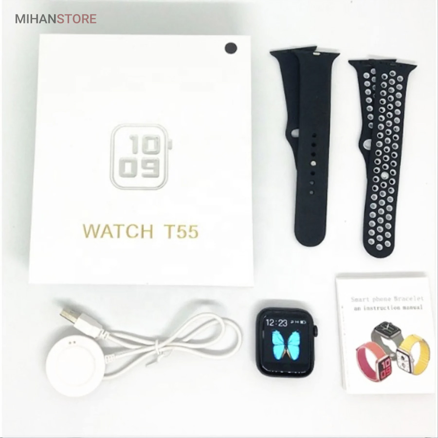 ساعت هوشمند مدل T55 یک گجت پوشیدنی شیک با طراحی خاص و متناسب با نیاز های امروزی است. این ساعت هوشمند دارای صفحه نمایش لمسی و تم منوی جدید است. در ساخت این ساعت هوشمند حساسیت های ویژه ای جهت رقابت با محصولات مشابه خرج شده که از جمله آن ها می توان به حسگر شمارش ضربان قلب آن اشاره نمود. از جمله کارهای دیگر این ساعت می توان به قابلیت پایش خواب ، نمایش اعلانات شبکه های اجتماعی ، نمایش زمان ، نماشی کالری سوزانده شده ، حالات مختلف ورزشی و بسیاری از قابلیت های دیگر که زندگی شما را هوشمند می سازد، اشاره کرد. از دیگر قابلیت های خاص این ساعت هوشمند می توان به باتری قدرتمند لیتیوم پلیمری آن اشاره نمود.T55 یک گجت با کیفیت است که دارای بند قابل تعویض و گواهی IP67 می باشد که آن را در برابر آب و گرد و غبار مقاوم میکند. برای استفاده از تمام قابلیت های این ساعت کافیست برنامه ی آن را بر روی گوشی Android و IOS خود نصب کنید و از داشتن این مچبند هوشمند فوق العاده که در رنگ های متفاوت با صفحه نمایش 1.54 inch که برای آن تعبیه شده لذت ببرید.این ساعت کاملا لمسی میباشد که تمام صفحه نیست و حاشیه دارد.  از مزیت های قابل ذکر این محصول میتوانیم با قابلیت اتصال به بلوتوث جهت همسان سازی با گوشی اشاره کنیم،ساعت هوشمند مدل T55 با وجود دارا بودن حسگر شتاب سنج،قابلیت رد تماس،تنظیم هشدار روزانه،ژیروسکوپ و شمارنده ضربان قلب،تعیین اهداف ورزشی و..جذابیت ساعت را بیشتر کرده است.  همچنین این ساعت به تمامی دستگاه های اندرویدی وIos متصل خواهد شد،این گجت هوشمند توسط یک کابل مغناطیسی شارژ میشود.ساعت های هوشمندی که مشابه اپل واچ های شرکت اپل می باشد بسیار محبوب و پر فروش می باشند. ساعت هوشمند T55 با ظاهری مشابه واچ های اپل، با قیمت مناسب و امکاناتش حرفی برای گفتن پیدا کرده است. ساعت هوشمند T55 سبک، دارای وزن 32 گرم و با بند 42 گرم است.